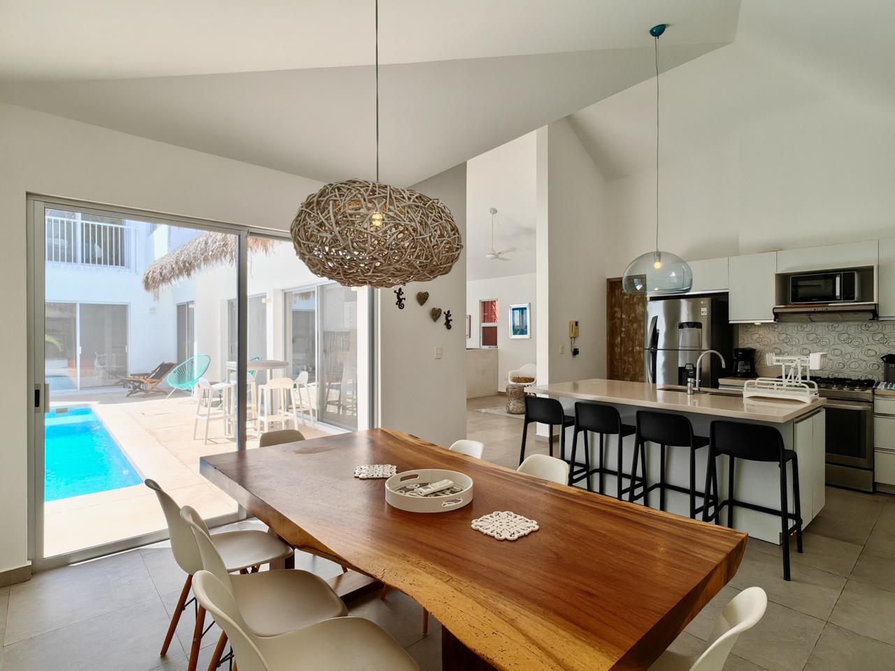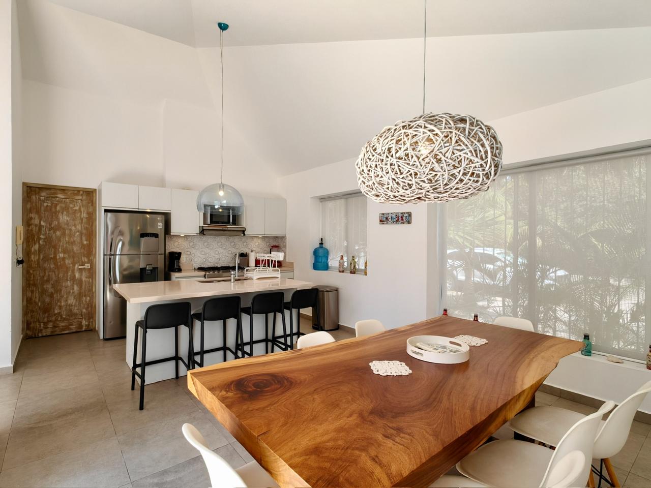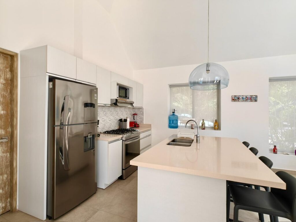 La cocina totalmente equipada cuenta con electrodomésticos modernos, incluyendo una estufa de gas y un refrigerador grande, además de acabados de calidad, gabinetes de madera hechos a medida y todos los utensilios necesarios, perfecta para recibir invitados o para estancias prolongadas.