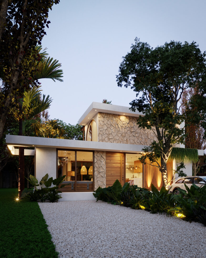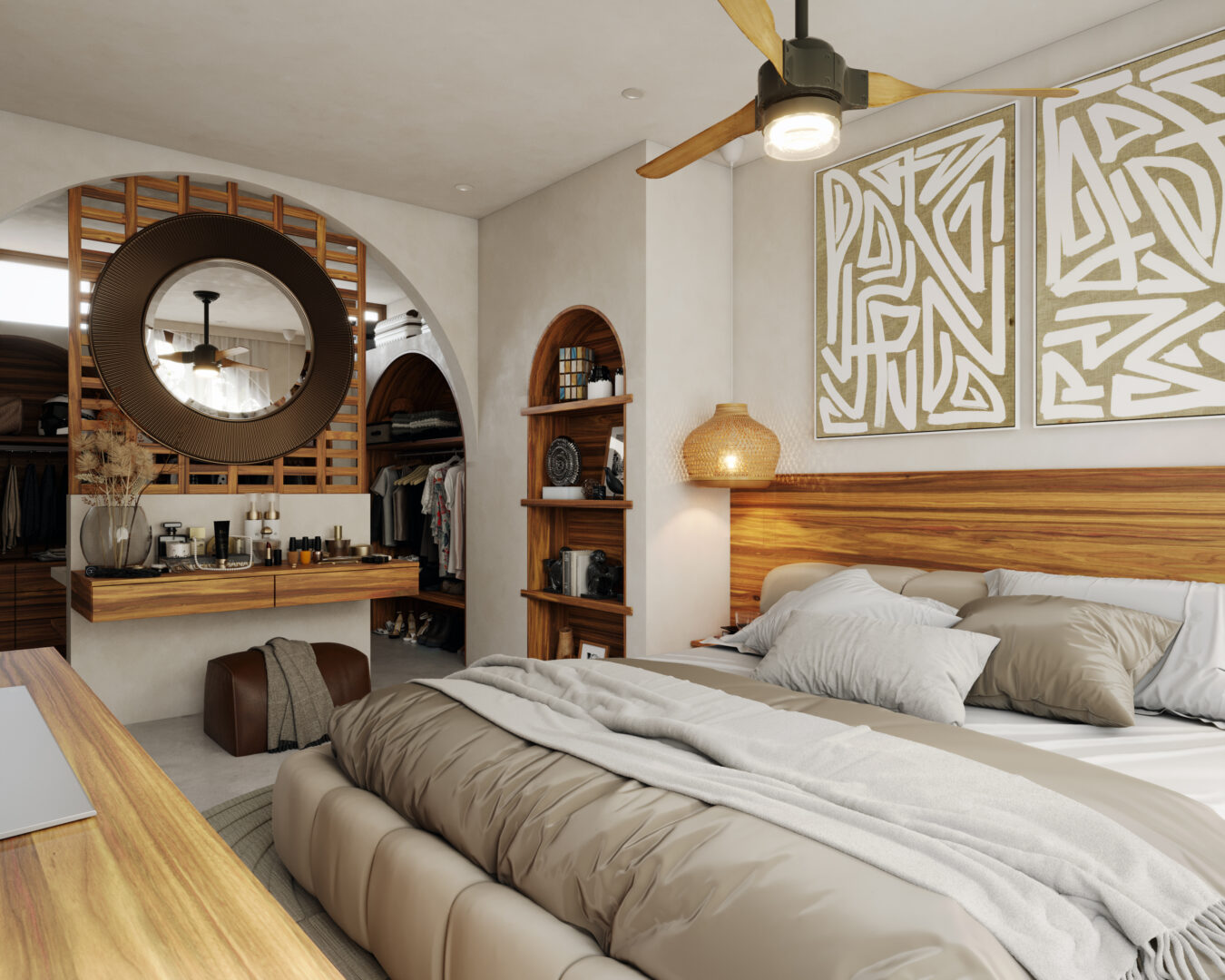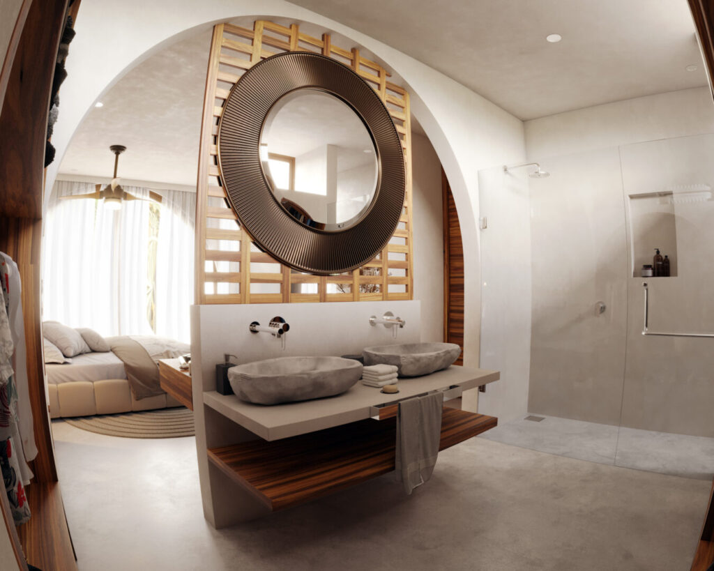Cada acceso y transición diluye los límites entre el interior y el exterior. La arquitectura, que fusiona la herencia maya con un lenguaje contemporáneo, logra un equilibrio perfecto entre amplitud e intimidad. El diseño invita a vivir momentos que perduran, mientras cada detalle ha sido cuidadosamente pensado para integrar el entorno natural al interior, creando una atmósfera de serenidad, armonía y lujo atemporal.