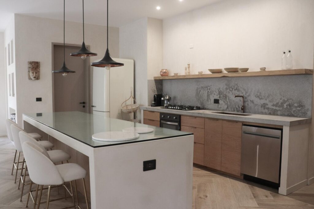 La cocina, en tonos claros y relajantes, irradia elegancia natural. Cuenta con una bodega independiente que brinda espacio adicional de almacenamiento sin comprometer el diseño minimalista y refinado del área.