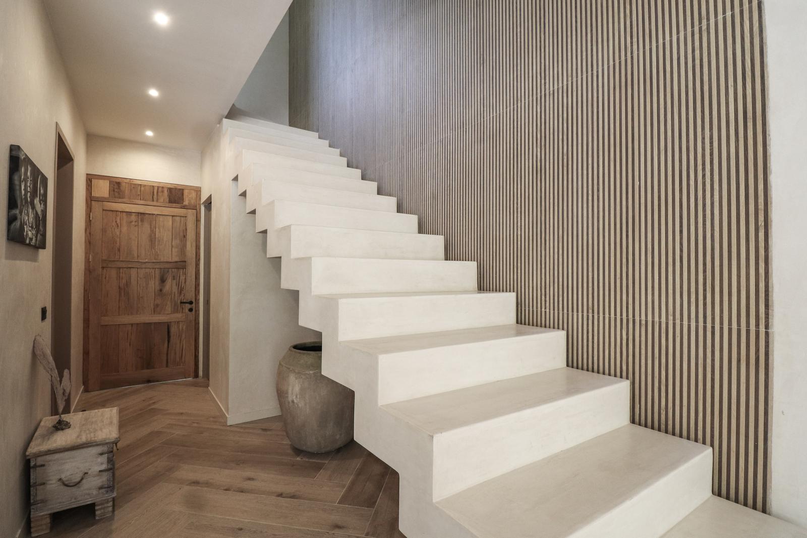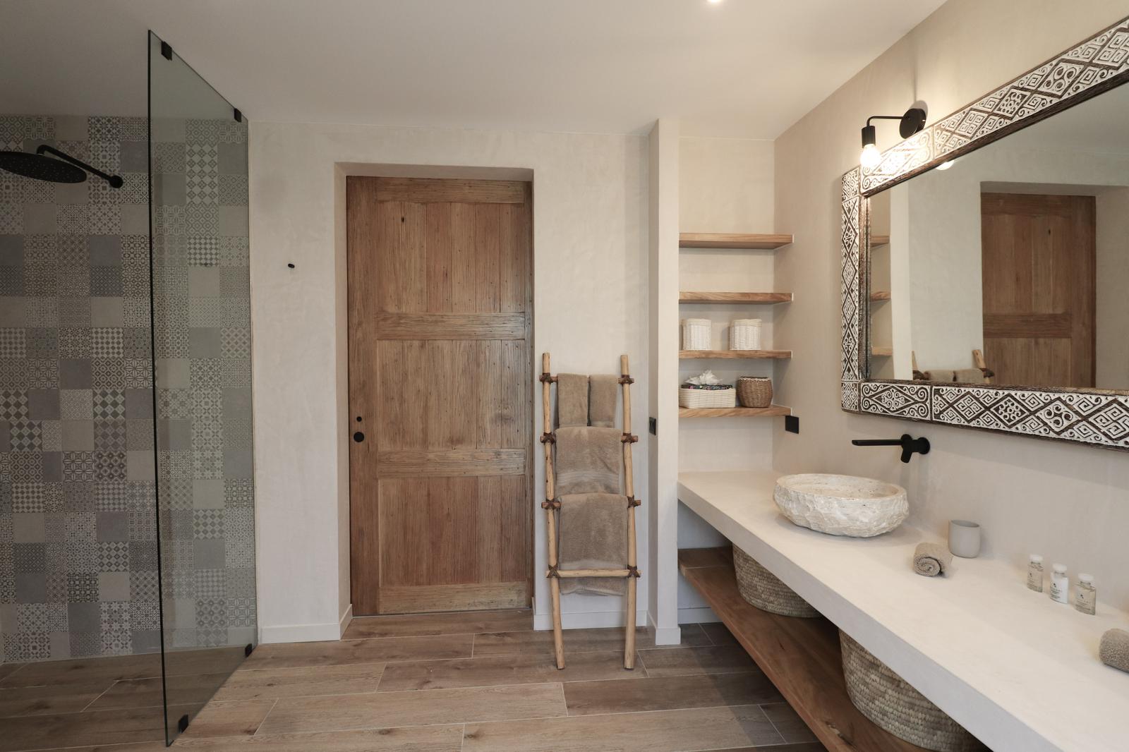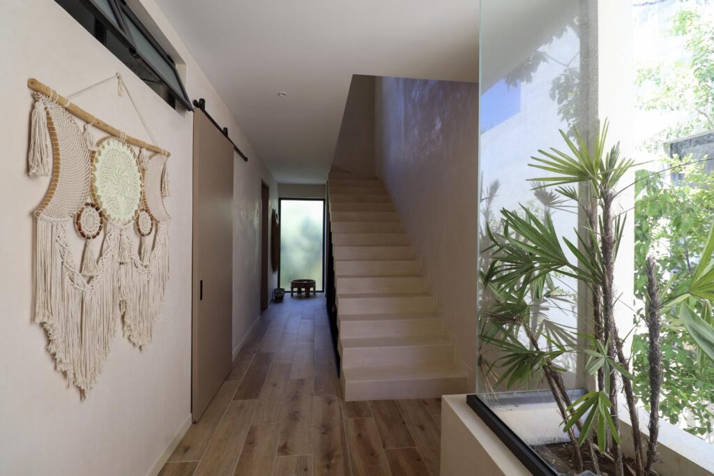 La luz natural cae en cascada sobre paredes revestidas con piedra maya y Chukum, proyectando sombras suaves que crean un ambiente cálido y relajante — un verdadero refugio para el alma.