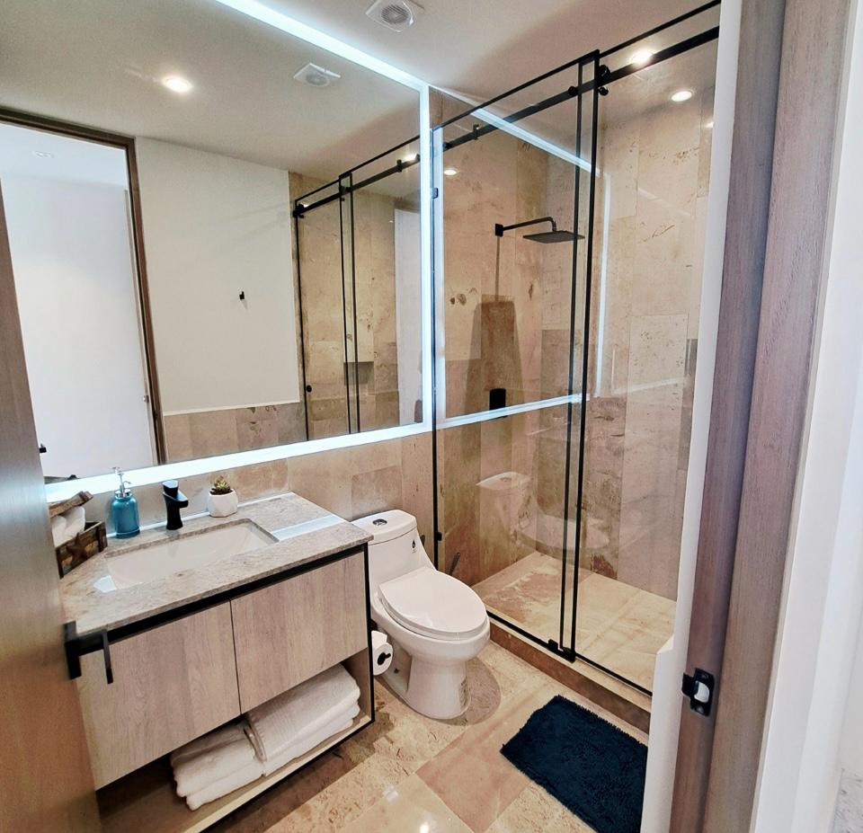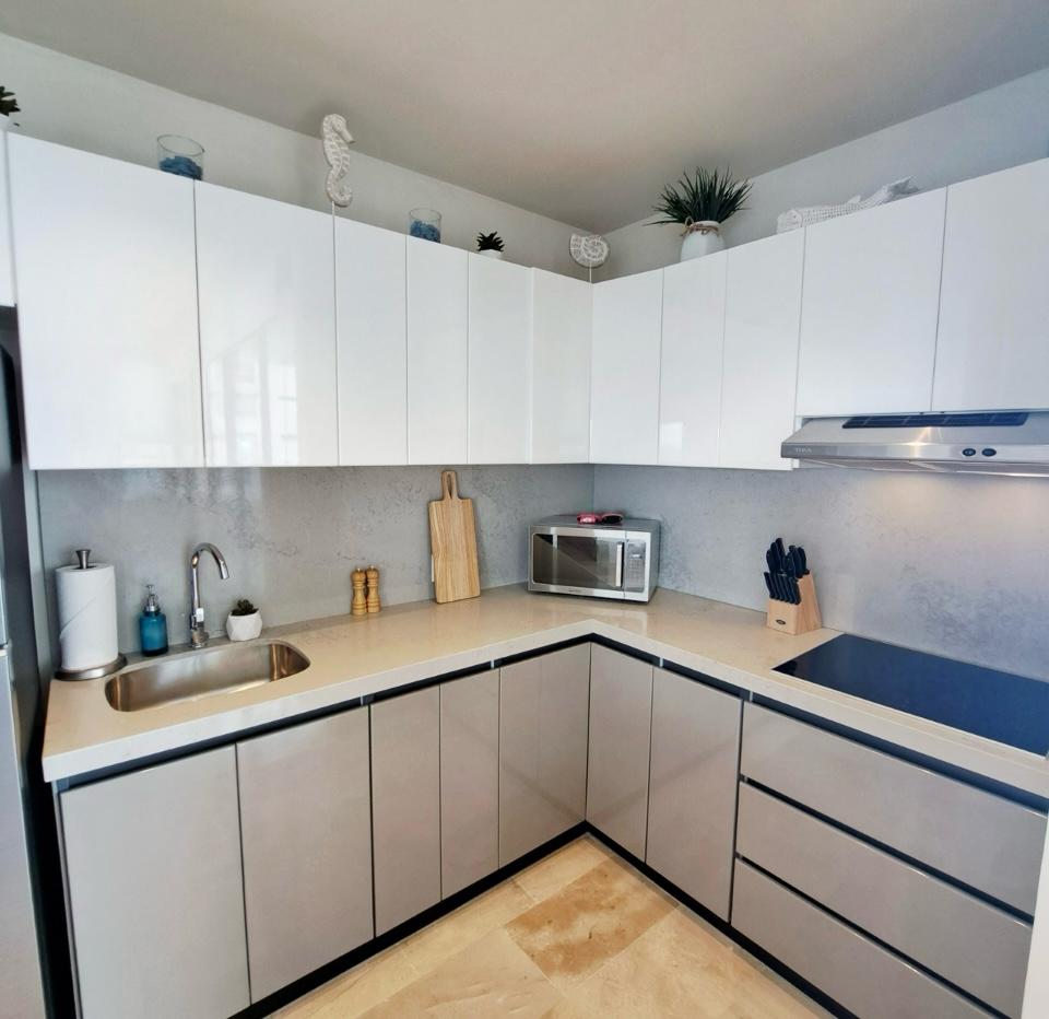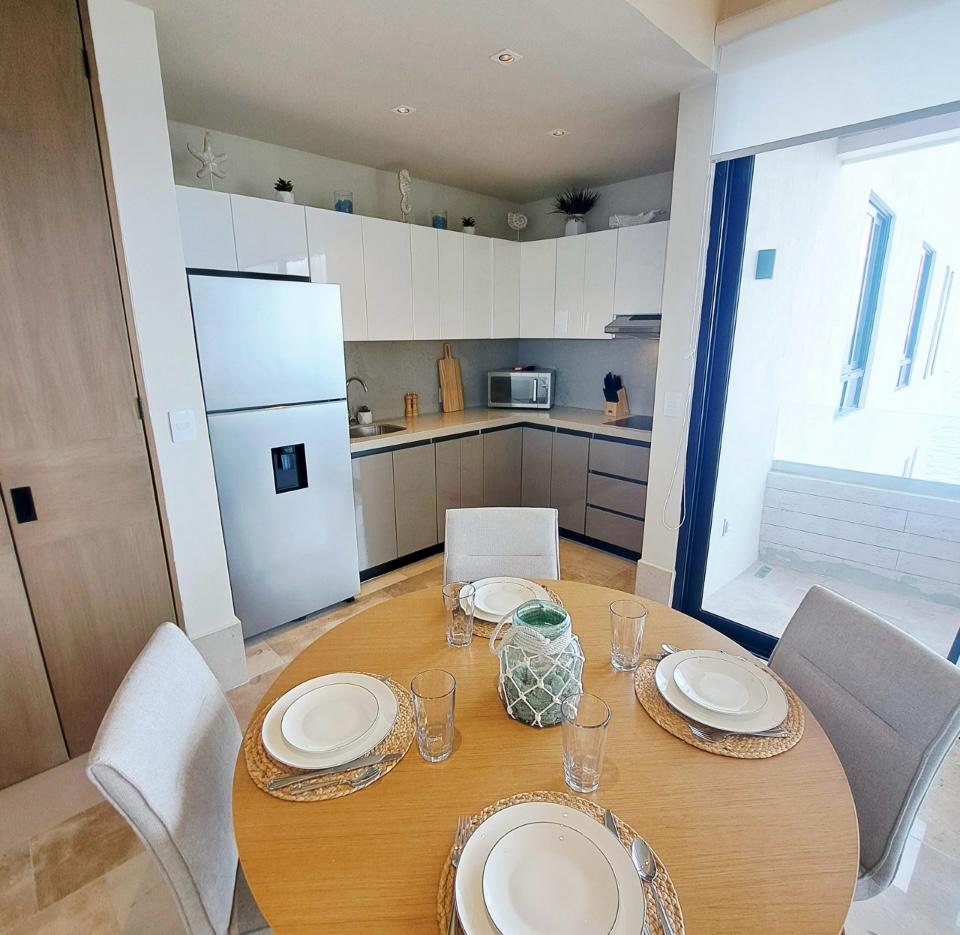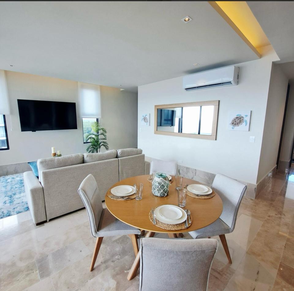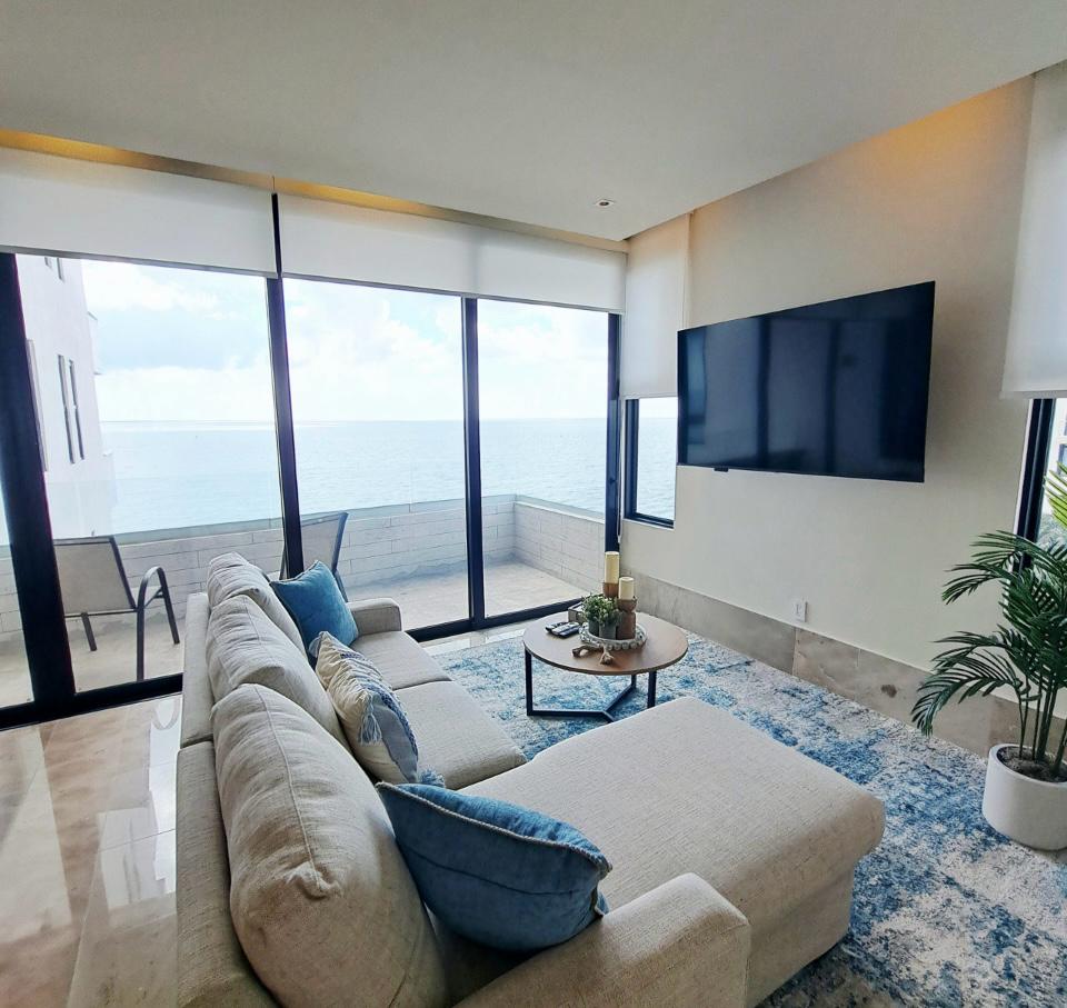 Situado en el cuarto nivel, el departamento ofrece un amplio espacio de sala y comedor de concepto abierto, inundado de luz natural. Sus ventanales de piso a techo enmarcan vistas panorámicas e ininterrumpidas del océano, creando el ambiente ideal para despertar con el sonido de las olas y disfrutar de atardeceres inolvidables desde la comodidad de tu hogar.